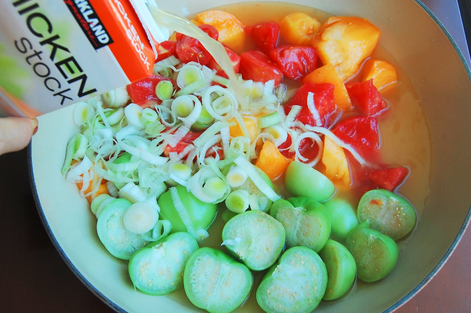 Here's my take from the Farmer's Market this weekend: beautiful heirloom tomatoes (I asked for the best cooking tomatoes, meaty and light on the acid), some of those funny green tomatillos, and nice young leeks so small they look almost like scallions. Not interchangeable! Leeks seem tough when you slice them but their flavor is oniony but wonderfully mild and just a little heat almost makes them melt.